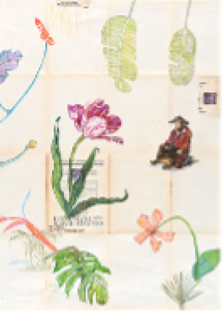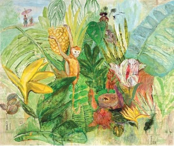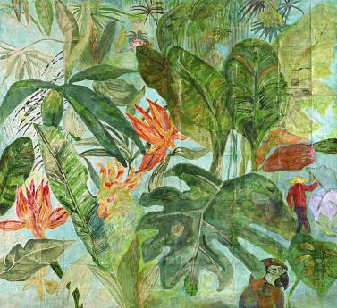 In Aliki Palaska's new exhibition, floral fragments, historical documents and quotations from colonial imagery interweave to create poetic yet political pictorial spaces. Working with large-format canvases and old, spread-out maps, the artist unfolds lush, almost overwhelming vegetation. She invites viewers into a tropical universe that is both promise and fiction, nature and construction. Plants, animals and human figures merge into a dense, rhythmically moving fabric of colour and line — a vibrant interplay of chlorophyll green, yellow, turquoise and orange. There is no central motif or linear narrative. The foreground and background dissolve and small scenes open up amongst the plants and animals, acting as windows into distant times or stories. Here, the vegetal is understood not naturalistically but emotionally—Palaska stages a field of tension between human appropriation, colonial domination, and the untamed vitality of the natural world.